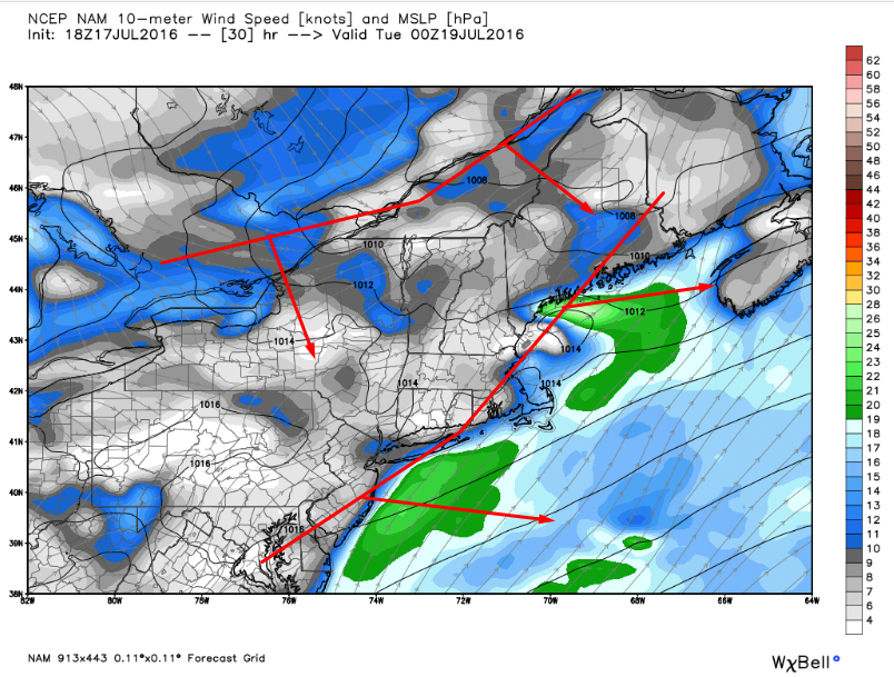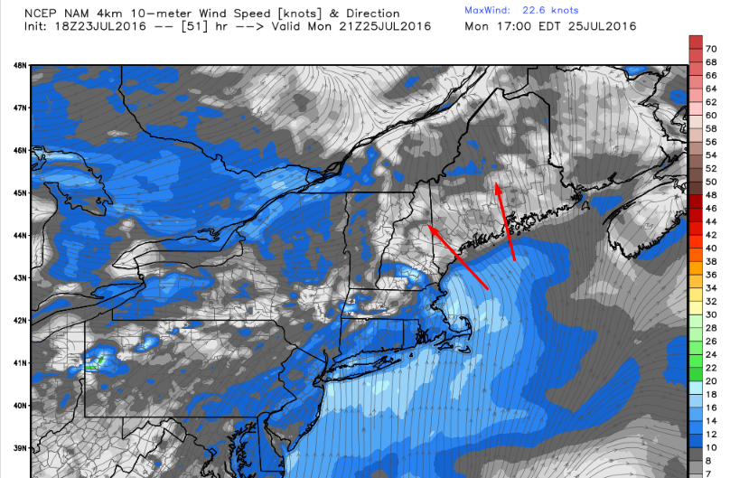NAM Showing Onshore Winds Limiting Instability Monday. Image Credit: Weatherbell
