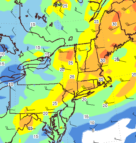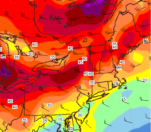 The forecast sounding for PWM tomorrow afternoon brings it all together. Notice the red and green lines (temps, and dew points) remain close to each other through the first 35kft+ of the atmosphere (as a side note for the hardcore weather geeks out there, that temp trace looks mighty close to the moist adiabat). Notice how sharply the red line goes from right (hot) to left (cold) in the first 5kft. This indicates very steep lapse rates (of up to 11c/km!) which also supports strong storms. Strong winds throughout the atmosphere will help organize the storms into line segments capable of damaging winds. All in all, a pretty solid setup especially for New England.