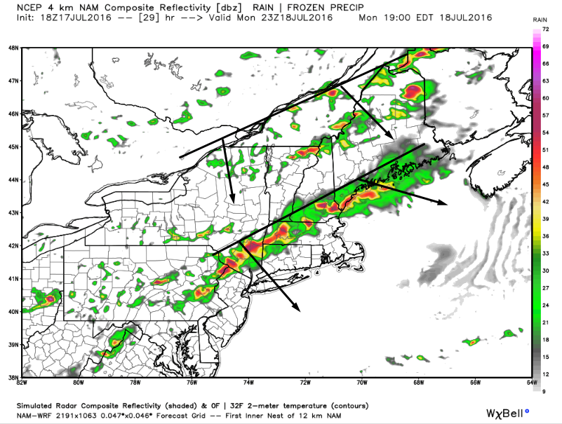 The pre-frontal trough will likely focus storms along the coast and south into SNE during the late afternoon/evening hours. Farther north, we will turn to the cold front for thunderstorms in the mountains. These storms will likely be more of a mid to late evening affair as it will take longer for that area to destabilize due to morning clouds. Storms along the cold front itself will likely be more hit or miss but could pack more of a punch as they won’t have tons of competition. These storms will fizzle as they head into the atmosphere cooled and stabilized by the pre-frontal trough convection.