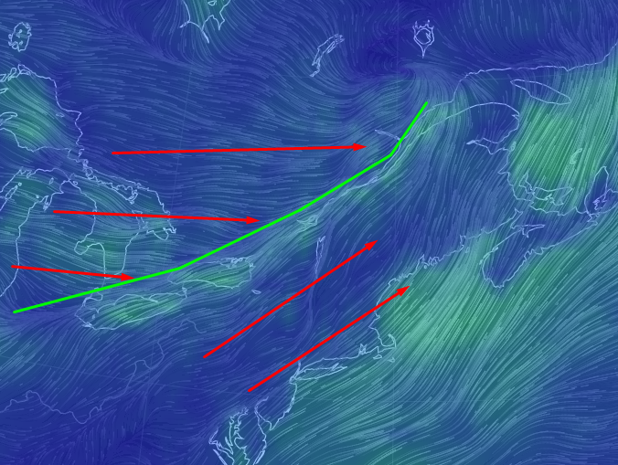 A band of strong winds and powerful shear will rotate around the disturbance today. The strongest winds will be pointing at Southern New England while Northern Maine sits in the calm aloft associated with the disturbance being to their south. In southern Maine/New Hampshire, we’re a bit on the edge. We likely see enough shear to get some small clusters but large squall lines are unlikely. If that disturbance can intensify enough fast enough, it could pull some of those winds north and we could see a bit more action. If it remains a little weaker, those winds will continue screaming towards SNE. These winds will be our organizer.