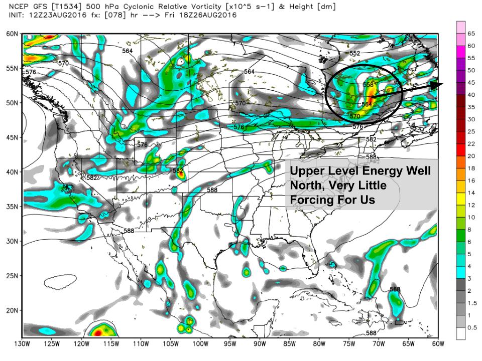Not a whole lot of excitement as we head into the extended forecast. High pressure is locked in at least through early next week with, guess what, more warm and dry conditions. A weak front could approach by the middle of next week but looking at how strong the Bermuda high looks to be during that time, I wouldn’t be surprised to see that shear out to the north following in the footsteps of the front on Thursday night.