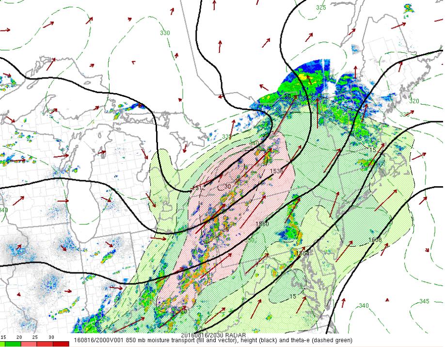 Aloft, a disturbance over the Eastern Great Lakes will move rapidly NE tonight. SW winds ahead of this disturbance will pump a warm moist airmass into the region. This airmass will feature more Precipitable Water values in excess of 2″ which will support very heavy rain. Pictured is the 850mb moisture field (RH) and vectors showing where that moisture is going (arrows). Notice all the arrows pointing in our direction. This shows that the moisture is headed our way overnight tonight.