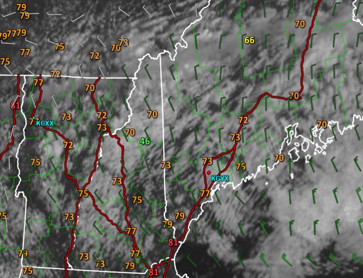 Today’s forecast worked out fairly well. Morning showers across the mountains drifted SE and weakened before evaporating all together. NW winds were breezy as forecast and the upslope/downslope pattern was evident in both cloud cover and temps. Note the more widespread clouds and associated cooler temps over the mountains while more sun and associated warmer temps could be found over southern areas. Temps rose into the 70’s as expected with a couple of low 80’s in southern NH. While it was a little cloudier along the coast than forecast, overall today was a fairly successful forecast.