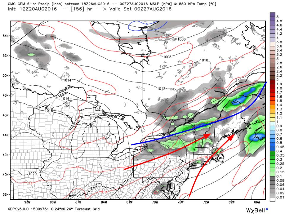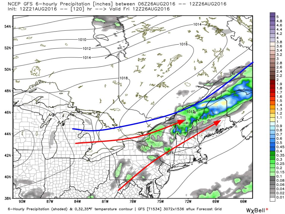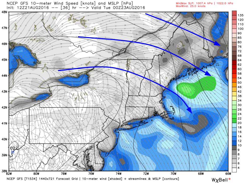 High pressure will slip just to our south (black circle) tonight as the cool winds of today prepare to give way to the warm breezes of tomorrow. In between, there won’t be any wind and as a result, temps will fall into the 40’s for most tonight with some 50’s across the south and east. Some of the most sheltered mountain valleys could see temps right around or even a little below 40. Radiational cooling does wonders! Warm and dry conditions are expected for tomorrow with highs generally in the 70’s.