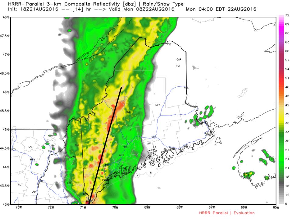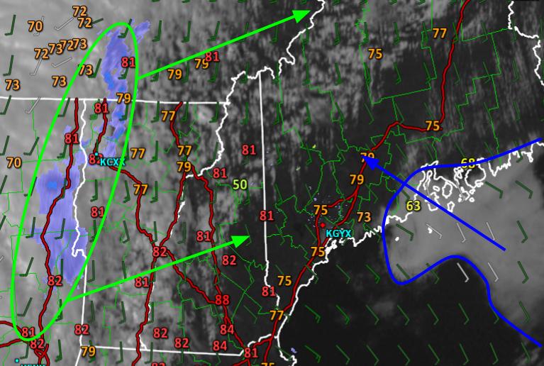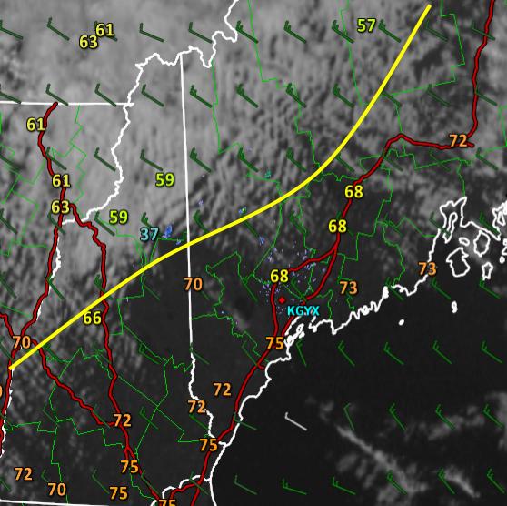Today’s forecast worked out quite well. Morning rain moved out right on time and by 8:30 or so even the easternmost reaches of the midcoast were dry. Clearing quickly followed, as forecast, and temps rose into the 60’s and 70’s, also as forecast. The upslope/downslope pattern I talked about this morning is clearly visible on the satellite imagery this afternoon with clouds over the mountains and sun along the coast. The one mistake on the forecast was to overestimate temps in Northern NH. Areas under the clouds barely made it to 60 and spent most of the day in the 50’s which was a bit cooler than I thought.