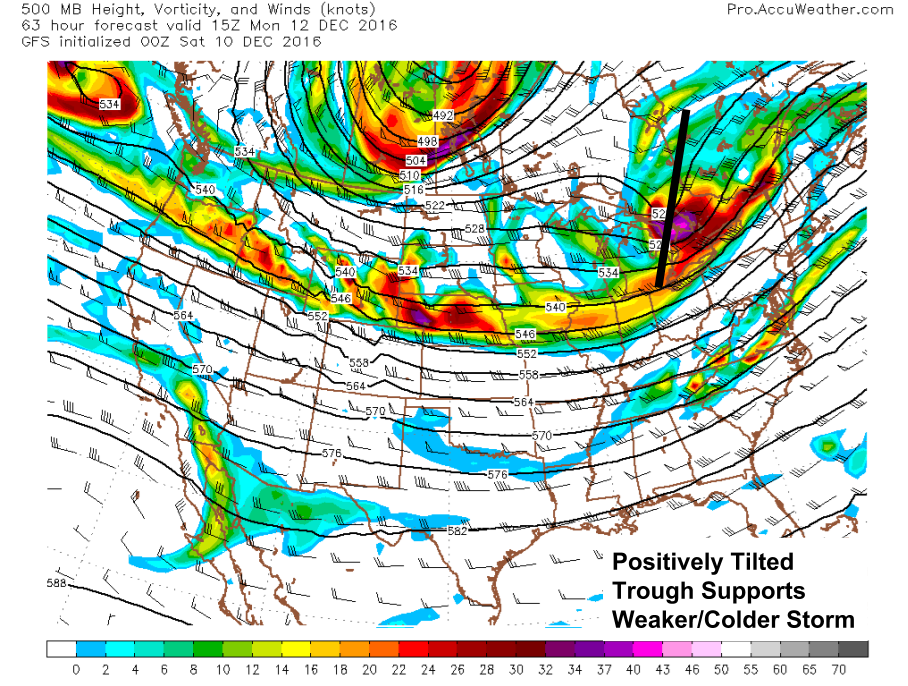 Those who have read my discussions for a while know that I often focus on the behavior of troughs and ridges at 500mb (~25,000 feet) to determine how storms at the surface will behave. Monday’s storm has weak upper level support at both the 500mb and 300mb levels. The positively tilted 500mb trough means that there isn’t enough energy for a storm to strengthen. Weaker storms have a harder time uprooting well entrenched cold air like that sitting over New England now.