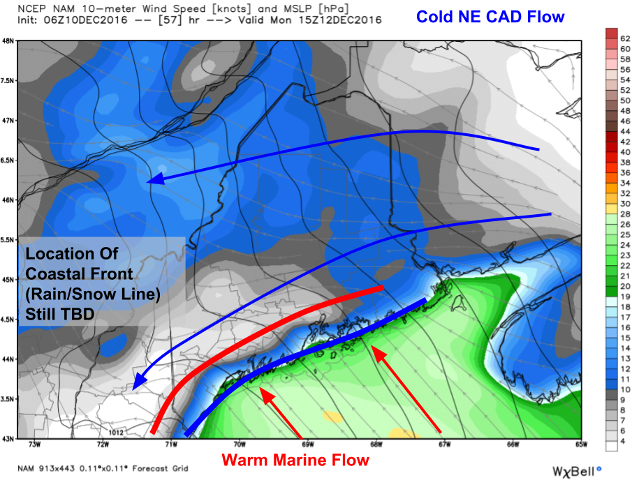 The snowfall forecast for the coast will hinge on the westward progress of the coastal front which is the boundary between warm marine air and cold continental air. Most models currently bring it into the I-95 corridor but guidance has a notorious warm bias with these types of events. The immediate coast will likely mix regardless but I think the front will set up closer to rt 1/the beaches. Exactly where the coastal front sets up will determine who sees 4-6″ of snow and who barely gets 2″. Those who have lived in this area for a while know that the difference between the two can sometimes be a mile or two.