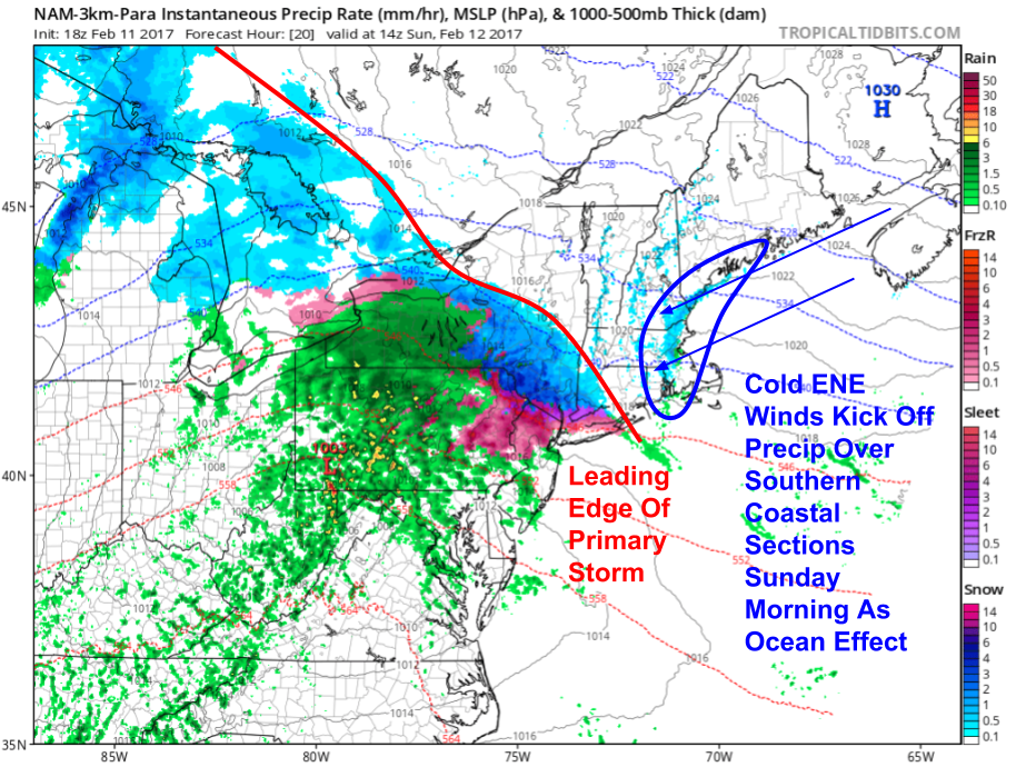 As cold high pressure noses in from the north tonight and tomorrow morning, winds will turn east-northeasterly resulting in some ocean effect snows along the coast SW of the midcoast. These will be fairly light and should only amount to an inch or two through the morning hours. The first part of the main event arrives a little later in the morning as the primary low pressure system approaches from the west.