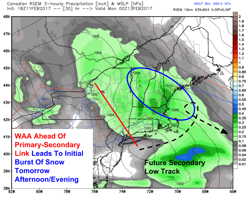 The first impactful round of snow will arrive from SW to NE tomorrow midday. It will be associated with the warm air advection aloft ahead of the primary low pressure system that will be weakening as it moves through NY state. The warm air overrunning the low-level cold air will produce moderate bands of snow for the entire area. Several inches of accumulation are likely to be associated with this. At this time, the secondary low will be in its infancy over the waters S of Long Island.