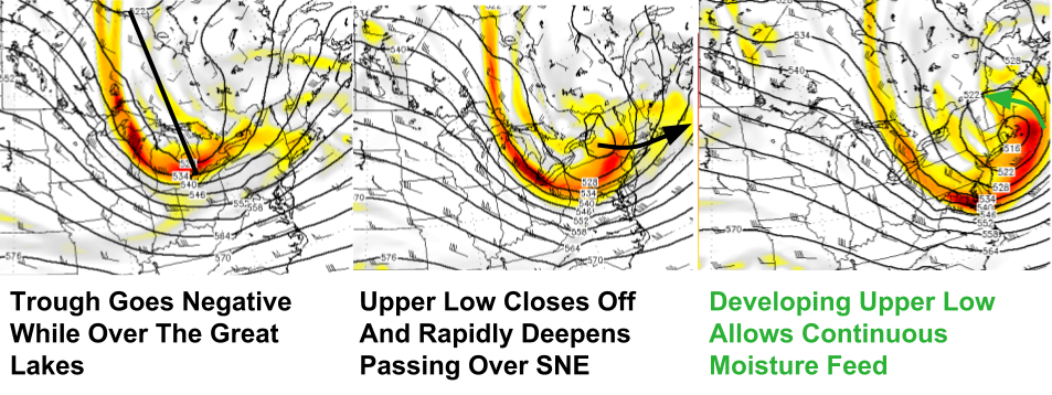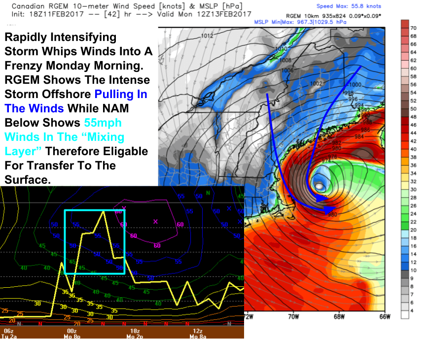 The real show begins when upper level energy diving SE through the midwest arrives at the coast and enables the secondary storm to explosively deepen. Model guidance suggests the low could deepen 28mb in 12 hours as it moves across Cape Cod and into the Gulf of Maine overnight Sunday and into Monday Morning. It’s during this phase that the real show occurs.