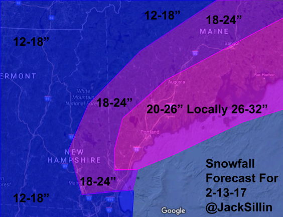 Here’s how much snow I think will fall. QPF values (liquid equivalent) range from a little under an inch north to over 2″ on the coast. Given fluffy ratios away from the coast, that inch could quickly turn into 18 or even 20 but confidence in the full inch falling is low enough for a 12-18″ forecast for the mountains. Along the coast, around 2″ of QPF is forecast but some of that will fall at lower ratios (or else we’d be looking at over 3 feet!) which means amounts will be held back to right around the 2 foot mark. In a band or two near the midcoast, I wouldn’t be shocked to see a 30″ report based on the fluff factor that will begin to set in as the storm wears on. I’ll adjust these numbers with any new data tomorrow morning!