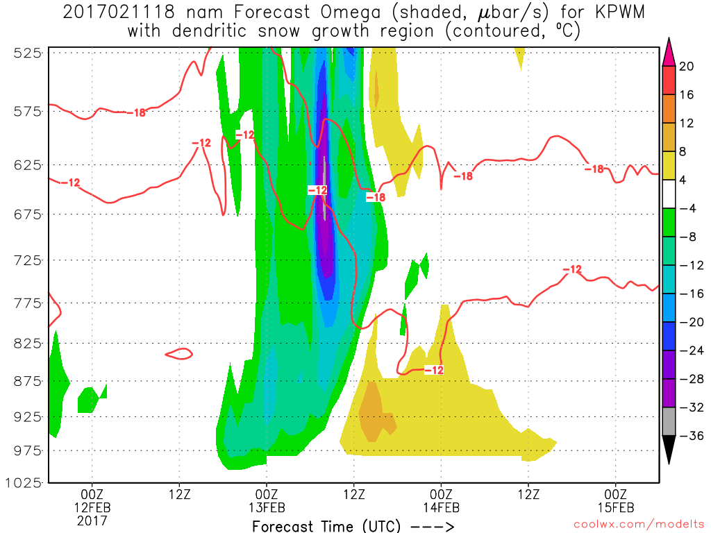 Here’s a plot from the 18Z NAM showing various parameters for Portland through time (which moves forward from right to left along the x-axis). Notice the sharp increase in snow ratios (light blue line) going from a typically heavy 10:1 ratio to a very fluffy 20:1 ratio as temps cool from 30F to 20F. Also notice the presence of instability aloft. That combined with tremendous upward motion means we could be woken up by claps of thunder Monday morning. Hopefully we’ll get the continuous thundersnow parts of CT saw with the storm Thursday but even one strike would be cool! Keep your eyes and ears open!