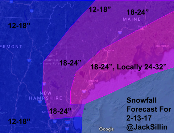 Radar this afternoon is showing bands of moderate snow working into the area from SW to NE. These will eventually overspread the entire area this evening and will continue through the overnight hours. During that time, the storm offshore will really get going and bands of snow will begin moving in off the ocean. As the storm stalls and slides out to sea, those bands will stall and then collapse SE with it. Where exactly these bands stall out tomorrow morning will determine who gets the jackpot totals. Under the heaviest bands, 30″ totals are a distinct possibility though only a few towns will see those so the general 18-24″ forecast stands.