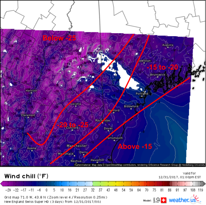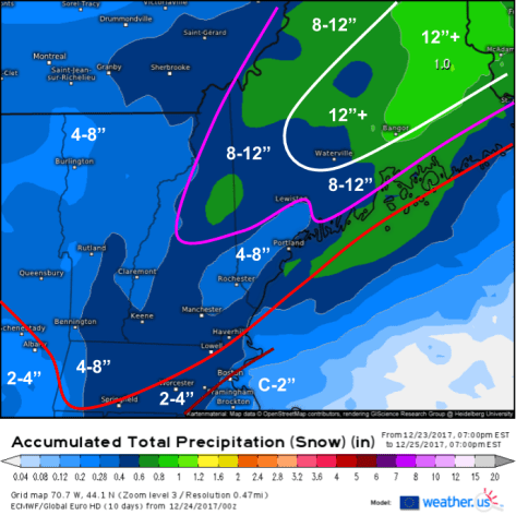 Here’s how much snow I’m expecting. The jackpot area will be found in the NE part of the region with areas NE of Augusta likely seeing around or a little over a foot of snow from this storm. Amounts will taper off to the southwest. There’s been a strong signal on model guidance for a region of mesoscale subsistence (sinking air) developing across parts of York and Cumberland counties. If this indeed develops, amounts will be lower there. Outside of that area, the immediate midcoast where snow could mix with sleet for a time, and the CT valley, 8-12″ is where we should come in for this event. It will be a fluffy snow due to the cold airmass and excellent snow growth dynamics.