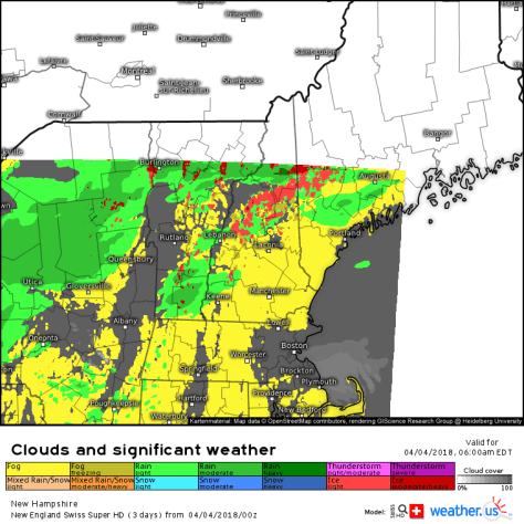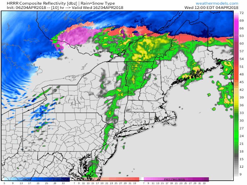 Today will be one of those days where you’ll be justified in saying “if you don’t like the weather in New England, wait 5 minutes”. We’ll run plays from each season’s playbook, ranging from winter’s freezing precipitation this morning to springlike highs near 60 to summertime thunderstorms to fall’s howling NW winds. Because there’s so much going on, this update will be a little more detailed than usual.