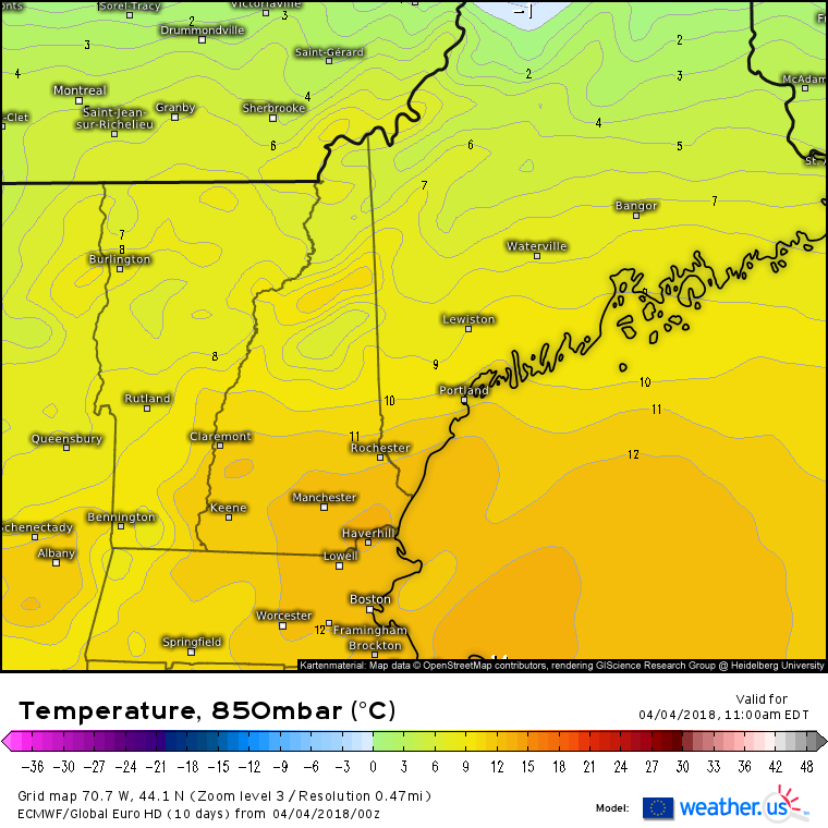 ECMWF 850mb (~5,000ft) temperature forecast for this morning showing very warm air just off the surface