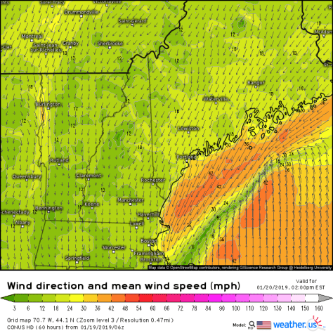 As the storm cranks up, look for winds to strengthen out of the NNE on Sunday afternoon. This will lead to blowing and drifting snow, especially in the mountains. At the coast, the wind and ice combo is never a good one, so expect some power outages, though thankfully the ice amounts expected (.1 to .25″) won’t be enough to cause crippling impacts.