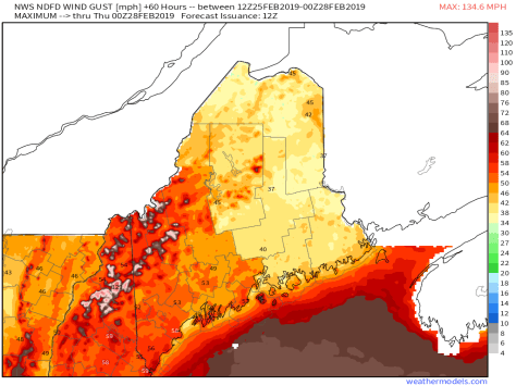 Here’s the NWS’s forecast for wind gusts today, and as you can see the majority of us will get above 50 mph at least once or twice. The strongest winds are of course up in the higher elevations, so maybe put the hiking and skiing on hold for today. If you’re curious, Mount Washington has already gusted to 144mph and the Observatory is forecasting gusts up to 165 mph. That’s the equivalent of what you’d find in some of the strongest hurricanes ever to make landfall!