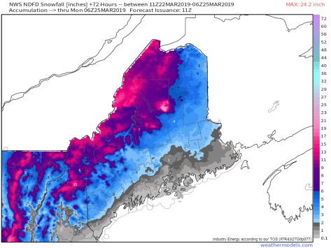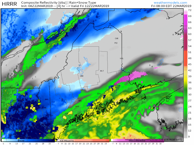 Along the coast we have another tricky forecast. Many coastal sites are reporting light snow or mixed precipitation this morning, and with the heavy precip banding now trying to move onshore, it’s possible that dynamic cooling briefly sustains this. A brief coating-2″ is possible in the next couple hours before a changeover to heavy rain. Some embedded thunderstorms are even possible in Penobscot Bay later during the lunchtime hour as deep tropical moisture rushes north. Temps will start in the low to mid 30’s this morning and rise into the upper 30’s to low 40’s this afternoon.