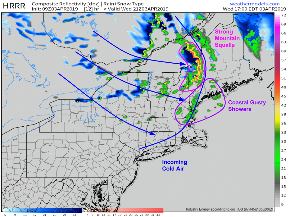 By 5 PM, we’ll be entering the third phase of the day with the arrival of a strong cold front. Showers and squalls will develop along the leading edge of that front, and could be fairly strong especially in the mountains. Today is the kind of day you look for small hail even in fairly “weak” showers. Up in the mountains, heavy rain will rapidly change over to heavy snow especially in higher elevations.