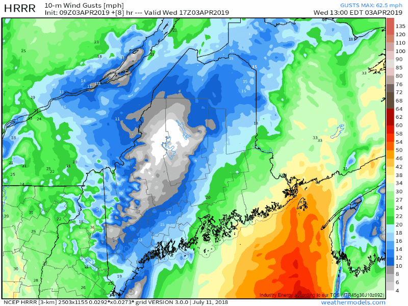 As that front moves through, winds will rapidly pick up out of the WNW. Gusts over 40 mph will be common across the area, with some places especially in the mountains getting up into the 50+ range. Of course gusts at higher elevations will be much higher. While these gusts won’t be strong enough to bring major impacts, scattered power outages are possible.