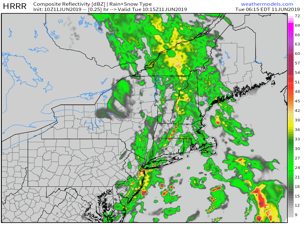 New Hampshire should ditch the rain between 10 this morning and the noontime hour. Clearing skies won’t be far behind. Farther east in Maine, expect rain to clear out between noon and 2 PM for all except far NE parts of the area which will stay ahead of the front for a little longer. The entire area should be enjoying clear skies in time for sunset.