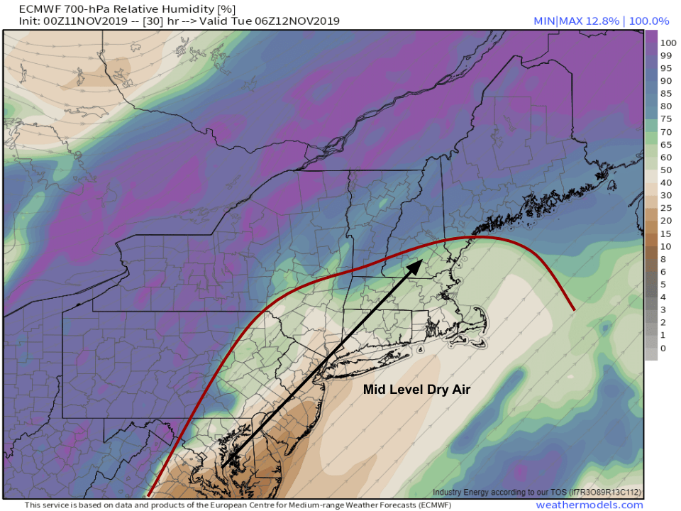 Later tonight, mid level dry air will race into the region ahead of the storm which will be moving through PA/NY. This means that we won’t be able to produce ice crystals in the clouds, so even if it were cold enough for snow, the flakes couldn’t form. As a result, everyone not within ~30 miles of the Canadian Border will go over to freezing drizzle (distinct, believe it or not, from freezing rain!) for several hours. While ice accretion will likely remain below the threshold for power outage impacts, this freezing drizzle will add a very slippery layer to sidewalks and roads before the Tuesday morning commute.