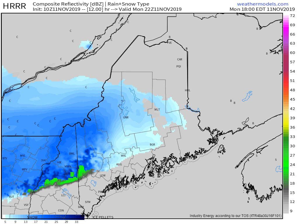 By 5PM, snow will be falling across most of the area’s northwestern half as the mid-level warm front associated with this system moves north. If you’re north of a roughly Lebanon NH-Lewiston-Belfast line, you can expect a period of snow this afternoon amounting to between a coating and 2″ with the highest totals in the northern mountains.