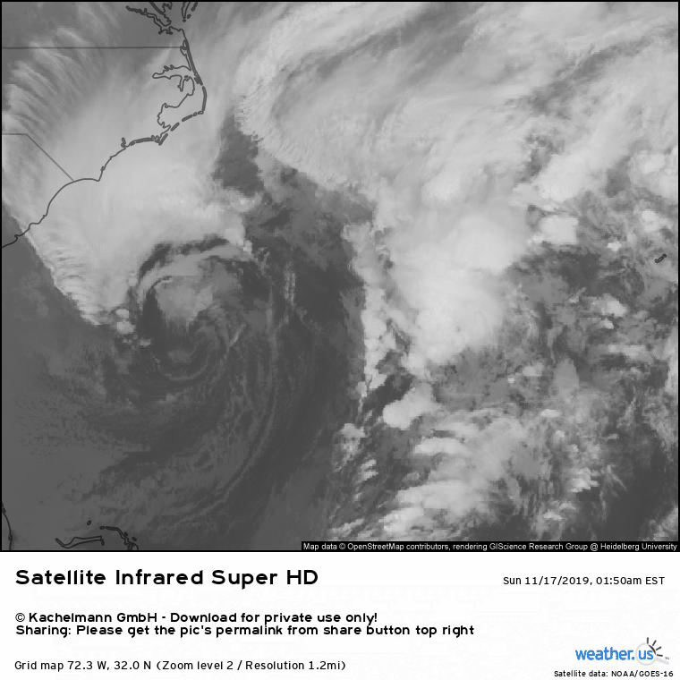 Those clouds will be moving north from a powerful ocean storm currently located east of South Carolina. I’ve included a little satellite loop of the system above, as it has a pretty neat almost-symmetric core. That storm will weaken as it moves our way tomorrow, but it does look to set up a bit of a freezing rain event for tomorrow night into Tuesday. At this time, I don’t think we’ll see enough ice accumulation for widespread power outages, but roads will certainly be slick and I can’t rule out a few outages especially farther inland.