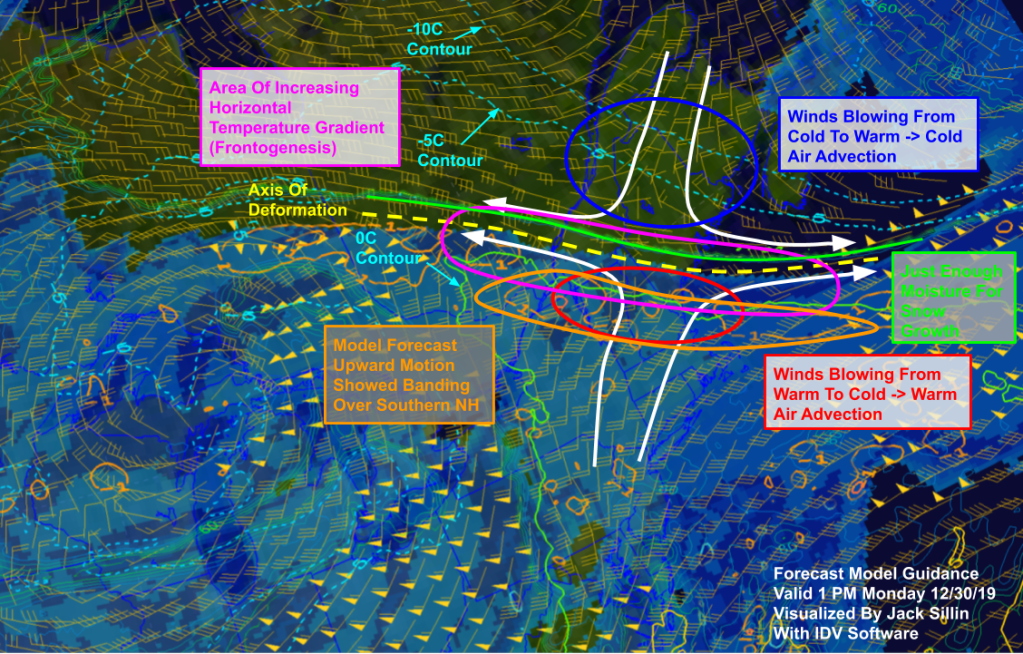 Sure enough, objective analysis products valid 1 PM on Monday show a narrow zone of frontogenesis producing heavy snow located just south of the deformation axis. This is consistent with the forecast model guidance analyzed above, and would also be consistent with the large scale setup visible on satellite imagery. A close look at the fundamentals (wind/temperature/moisture) in the mid levels would have made it pretty clear that heavy banded snow would continue through most of the day on Monday across central NH and SW Maine. Unfortunately, I figured that the model’s prediction of strong upward motion over MA/SW NH was reasonable and kept heavy snow out of the forecast.