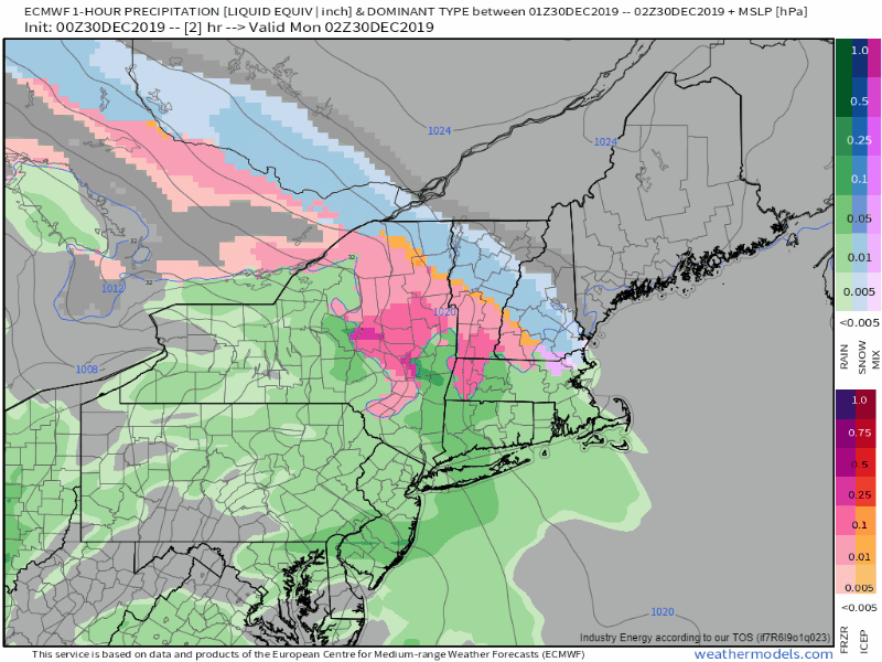 Helpfully, forecast model precipitation guidance such as the ECMWF shown above was in agreement with my conceptual model based on a general understanding of the large-scale pattern. I actually thought the ECMWF was a bit too bullish on its forecast for precipitation given that it was overpredicting dew points in the airmass to our northeast (the air moving in from Canada was drier than the model thought) but I didn’t adjust my forecast too much in that direction.