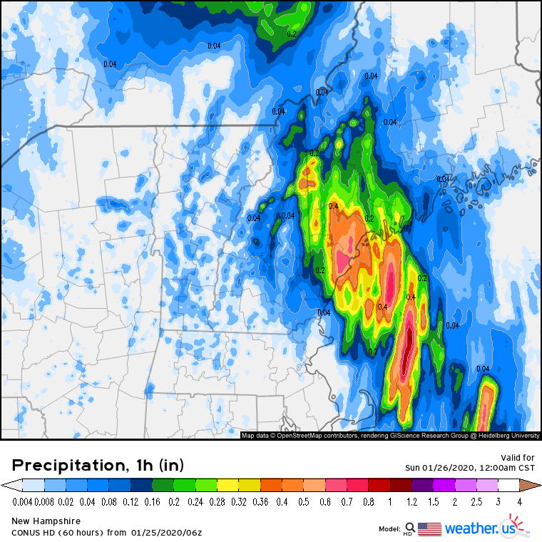 The other possible issue along the coastal plain will be very heavy rain as the front slices through an anomalously moist airmass. Around 1-2″ of rain is expected to fall in just a couple hours (note the hourly precip rates on the map above) and some small stream/poor drainage flooding is expected as a result. Because the storm is swinging through just after midnight, most of you probably won’t even notice this, but if you head out early on Sunday morning, make sure to keep your eyes out for residual high water spots.