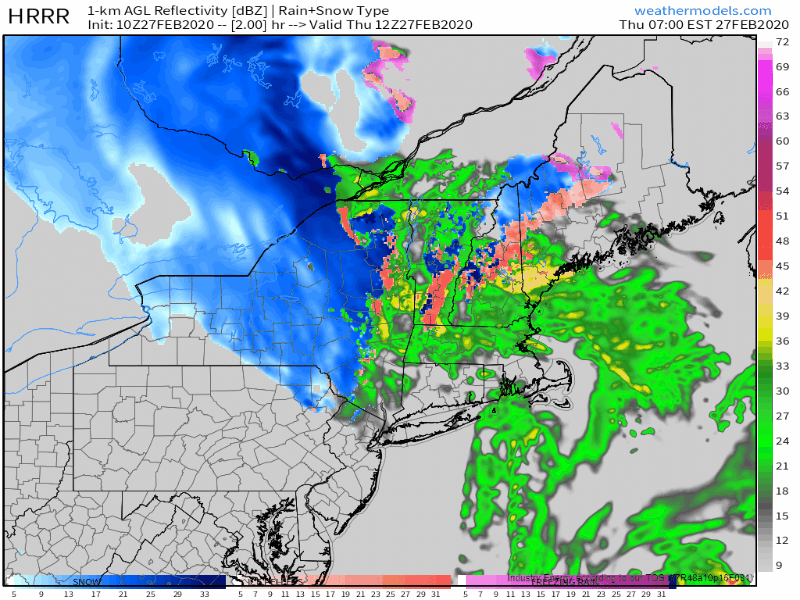 This simulated radar loop from the HRRR highlights the rapid forward motion of this system. Most of the precip in any given area will fall over a roughly 6 hour period. For the coast and southern foothills, this means a period of moderate to possibly heavy rain. While some ponding on roads is possible, I don’t see any major impacts from the warm side of this system. For the mountains, this heavy precipitation means extremely high snowfall rates possibly in excess of 2″ per hour at times this morning. Be sure to take it easy out on the roads if your plans take you into the hills north of route 2 this morning.
