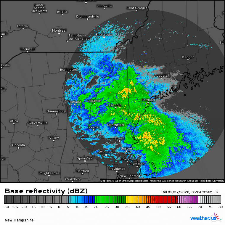 Rounds of heavier precipitation will arrive from the south over the next couple hours ahead of the storm’s occluded front which will be moving northeast. Behind that front, dry air will quickly race into the area and shut off precipitation. For SW NH, this could happen as soon as 8-9 AM. For Portland, this will likely happen around 11 AM or 12 PM, and for northeastern parts of the region, precip will linger until 2-4 PM.
