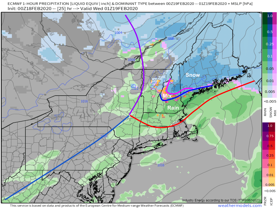 Because the system is moving off to our west, and there’s no high pressure system over New Brunswick to lock in the cold, a changeover to rain is expected at least in southern parts of the area. Southern NH and coastal York County ME likely end up with rain by around 4 PM before the above-freezing surface air advances to a roughly Lake Winnipeasaukee – Sebago Lake – Midcoast Route 1 line around 7-8 PM. I don’t think the surface warmth will make it much farther north than that, but some warm air aloft will support a mix of freezing rain and sleet after 6 PM or so in the foothills. The mountains should stay all snow.