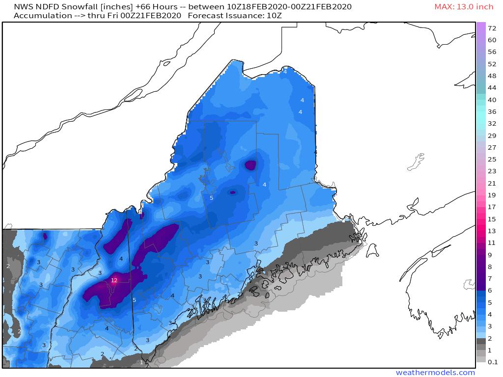 Here’s a look at how much snow our friends up at the NWS office in Gray (and, for northeastern Maine, Caribou) are expecting across the area today. As per usual, I might draw some of the contours slightly differently but those tweaks wouldn’t be significant. If you’re looking for >6″ of snow from this event, head up to the mountains. Most of the area will fall in the 3-6″ range while lower amounts are expected in southern NH and along the coastline (east of 95 south of Portland, south of Route 1 east of Brunswick) due to the expected changeover to rain.