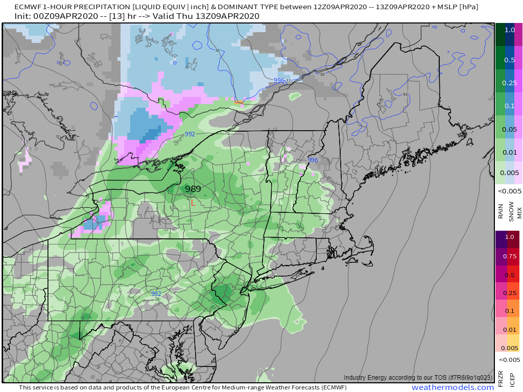 Precipitation will arrive in the area as light rain in SW NH between 8 and 9 this morning as a weak wave of low pressure develops along the primary low’s cold front over New York. When that first round of precipitation reaches the mountains, expect precipitation to fall as snow.