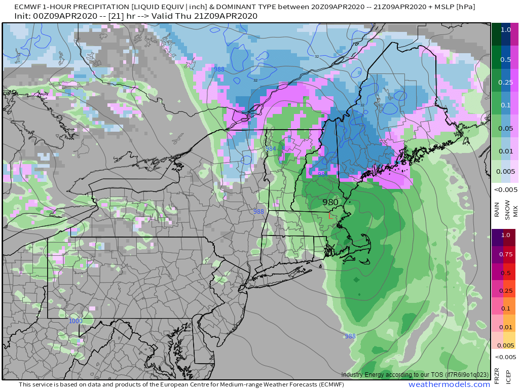 The secondary low will really begin to intensify as we move into the evening hours. As it does so, a combination of cooling due to intense upward motion, cooling due to the latent heat exchange that occurs when snowflakes melt, cold air advection on northeast winds, and cooling due to the sun going down will bring the rain/snow line back towards the coast. I think the ECMWF might be a bit optimistic about heavy snow falling in Freeport/Wiscasset/Rockland, but you won’t have to go very far north/west of those towns to get in on the action. While temperatures will remain above 32F outside the mountains, the intense dynamics associated with the rapidly intensifying storm will allow snowfall rates to push into 2-3″ per hour territory. When it’s snowing that hard, you’ll get accumulation even with surface temps 33-35F.
