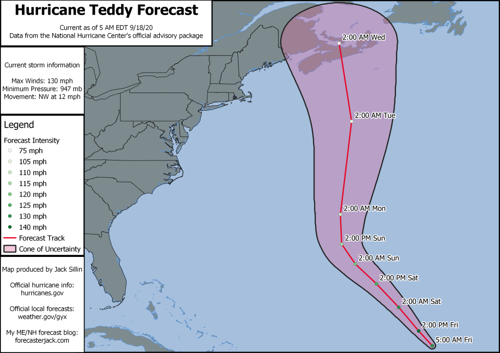 We’re not pawsitivly certain where this one will end up, but it looks to be in our general vicinity on Tuesday. The current NHC forecast is shown above and takes the storm into Nova Scotia as a powerful but barely extratropical hurricane. While we’ll certainly have to watch for any shifts west in the forecast track, at this point I do not expect the storm’s worst impacts to spread into our area. That said, we will likely see a period of breezy winds (potentially enough for power outages) as well as potentially some rain. The biggest story though will be the massive waves the cyclone looks to push our way starting on Sunday-Monday. Some of the wave forecasts are pretty incredible, especially if the storm becomes cut-off from the jet stream and meanders over the outer Gulf of Maine for a day or two. So for the pro surfers, wax up your boards and get stoked. For the rest of us, stay well away from the ocean!
