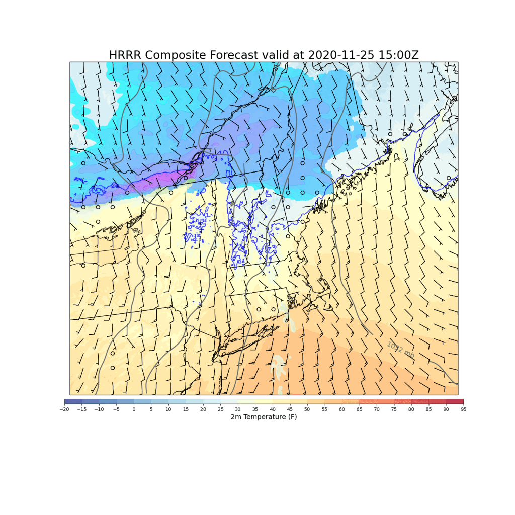 The colder temps and longer duration of precipitation/snow mean that parts of the mountains could pick up 2-4″ of snow today. 1-3″ is more likely in the foothills with a coating-2″ along the coastal plain north of Portland. York County and southern NH may not even see a single flake as low-level dry air evaporates whatever flurries are forming aloft.