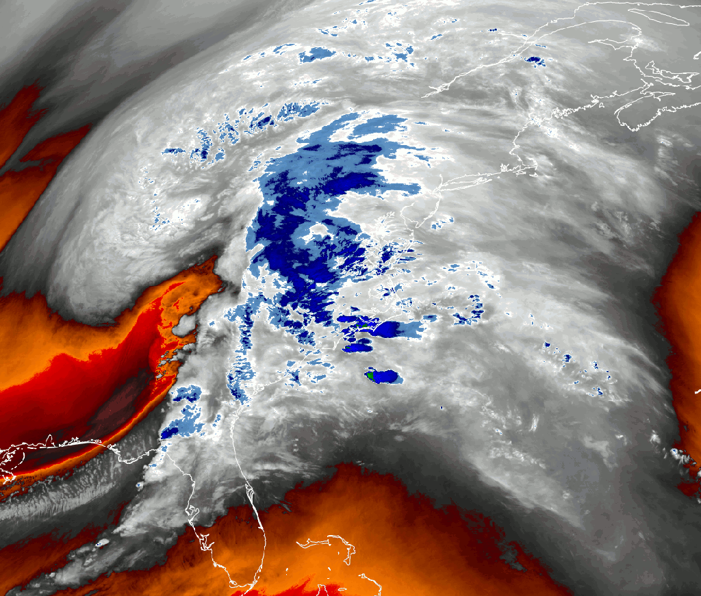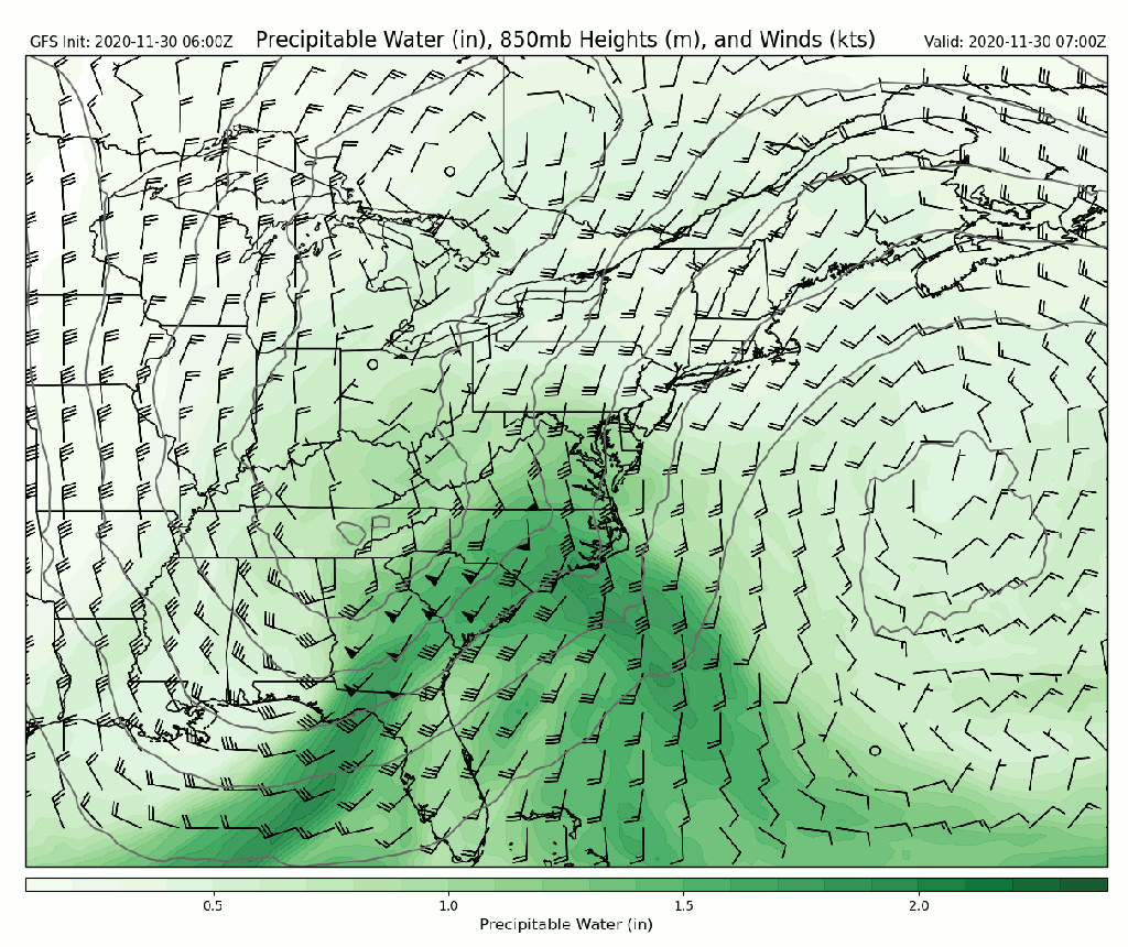 This forecast loop shows atmospheric moisture content and winds in that low-level jet I mentioned earlier. The strong southerly winds that we’re worried about causing power outages are also bringing a plume of moisture up from the deep tropics. It’s hard to overstate how unusual this airmass will be for our area for this time of year! That moisture will support very heavy rain tonight and tomorrow morning. The Midcoast and southeast-facing hills/mountains should expect 3-5″ of rain from this storm while most of the rest of Maine picks up 2-4″. New Hampshire won’t get the heavy rain for nearly as long tomorrow so will end up with a bit less (1-3″ outside the Whites).