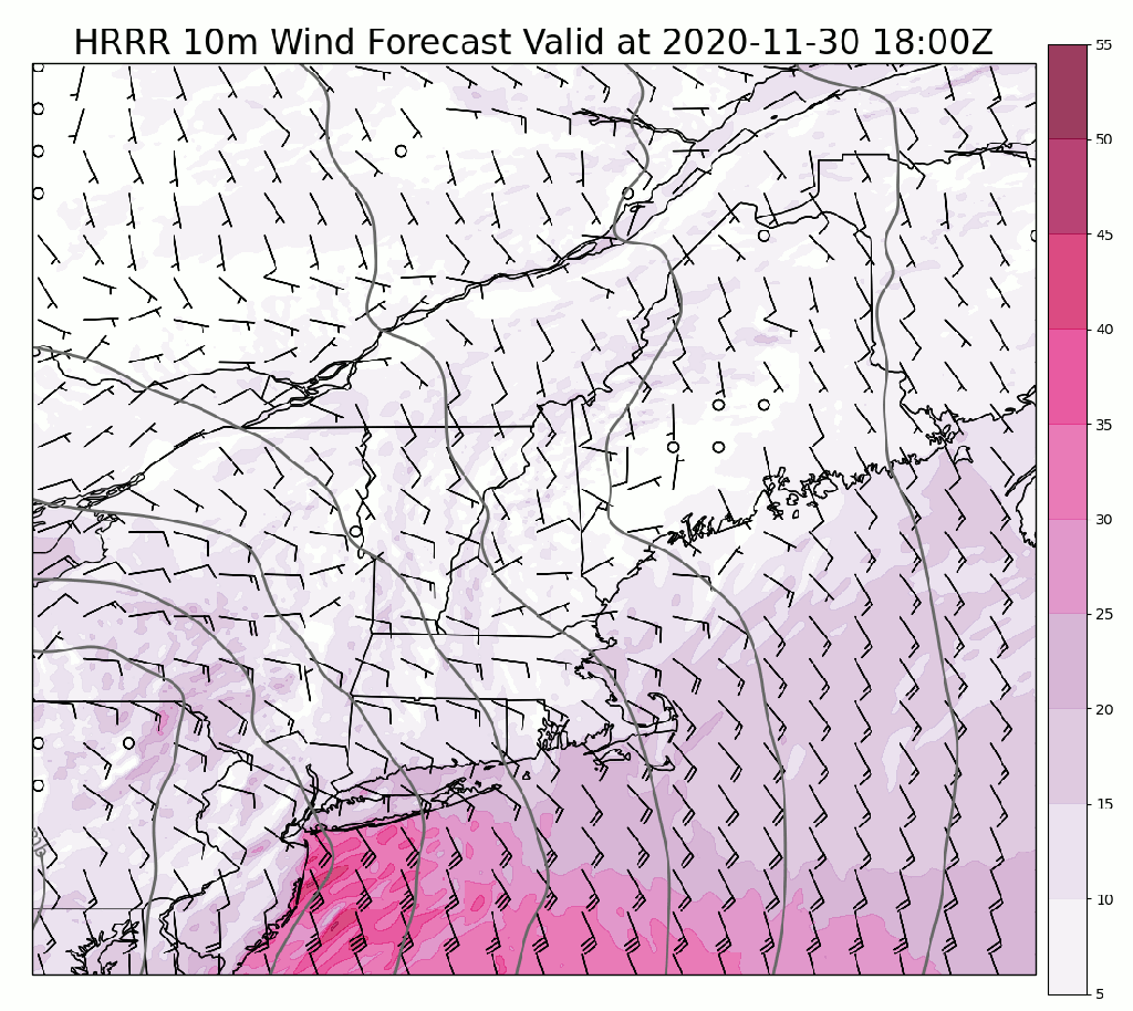 This animation shows forecasted wind speeds from 1 PM today to 1 PM tomorrow. Note the extended period of strong SE winds along the coast starting this evening and continuing into tomorrow before a cold front slowly pushes east and winds shift around to the southwest.