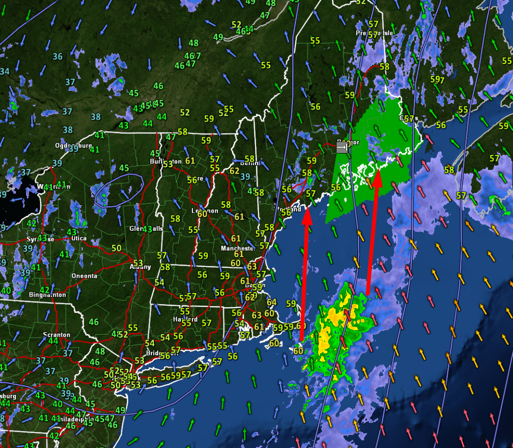 The storm that brought heavy rain to the region yesterday evening and knocked power out for nearly 100,000 of us last night is still producing unsettled weather across the area this morning. Winds are still gusty from the southeast, though not nearly as strong as last night. Rain is still falling, especially away from the coastline but is not nearly as heavy as yesterday afternoon. Temperatures this morning are anomalously warm, ranging from the upper 50s in much of Maine to the low 60s in NH. As an interesting footnote, this makes us the second-warmest part of the nation this morning, narrowly beating out southern California (low 50s) and coming in just behind the Florida Keys (upper 60s).