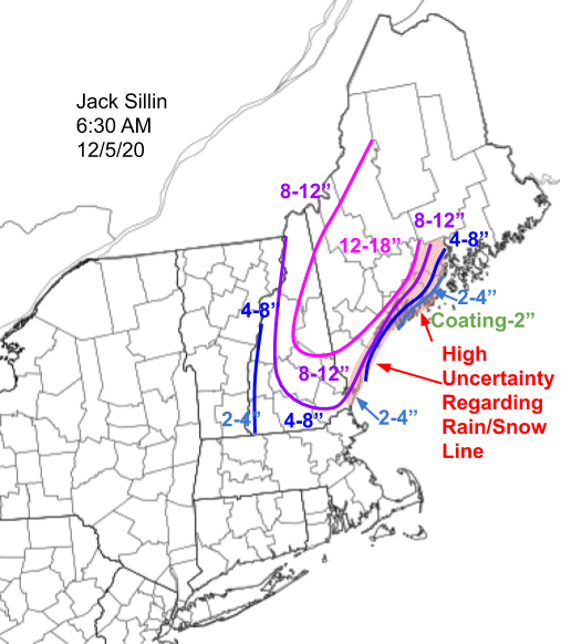 It’s always tough to tell where exactly the rain/snow line sets up and obviously that’s a pretty important part of the forecast. Right now, I’d draw it from the York County coast to Brunswick-Bath-Damariscotta-Belfast. Northwest of that line, snow totals will quickly ramp up to 8-12″ (or maybe a little more). But you won’t have to go very far southeast of that line to end up with bare ground. The big winner with this one will be the Sugarloaf area which could end up with as much as 18″. The snow up there won’t be the same cement that the coast will see but it won’t exactly be blower pow either. Honestly though, that’s good news. We want to build a dense base now so we’re not scraping rocks when the fluffier stuff hopefully shows up in January and February.