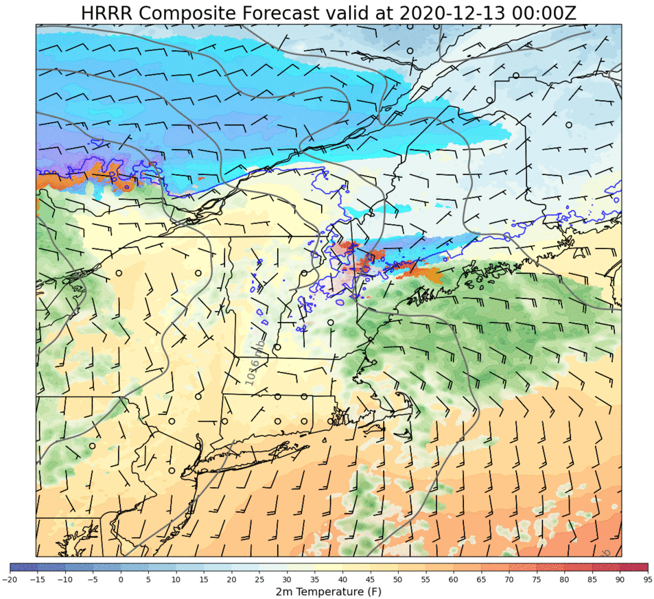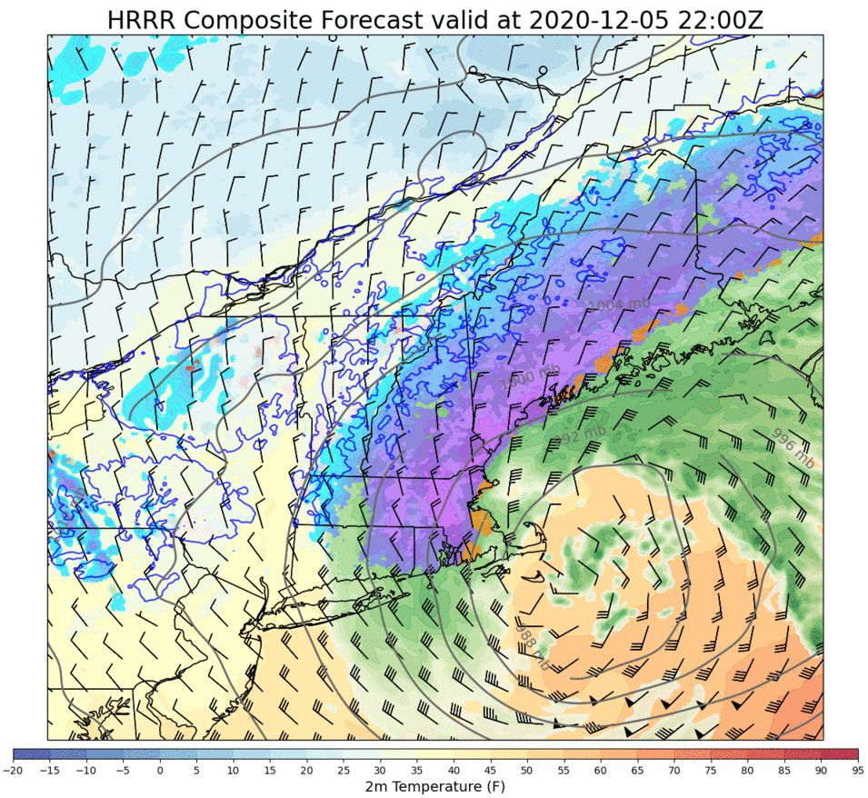 For those with a meteorological background, this loop contains a treasure trove of information about the storm’s forecast. But even if it just looks like pretty colors to you, hopefully you’ll find it a satisfying rendition to illustrate the merging of the disturbance over the Great Lakes with the disturbance over Missouri into a big storm approaching Cape Cod.