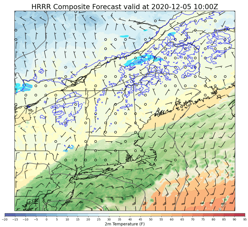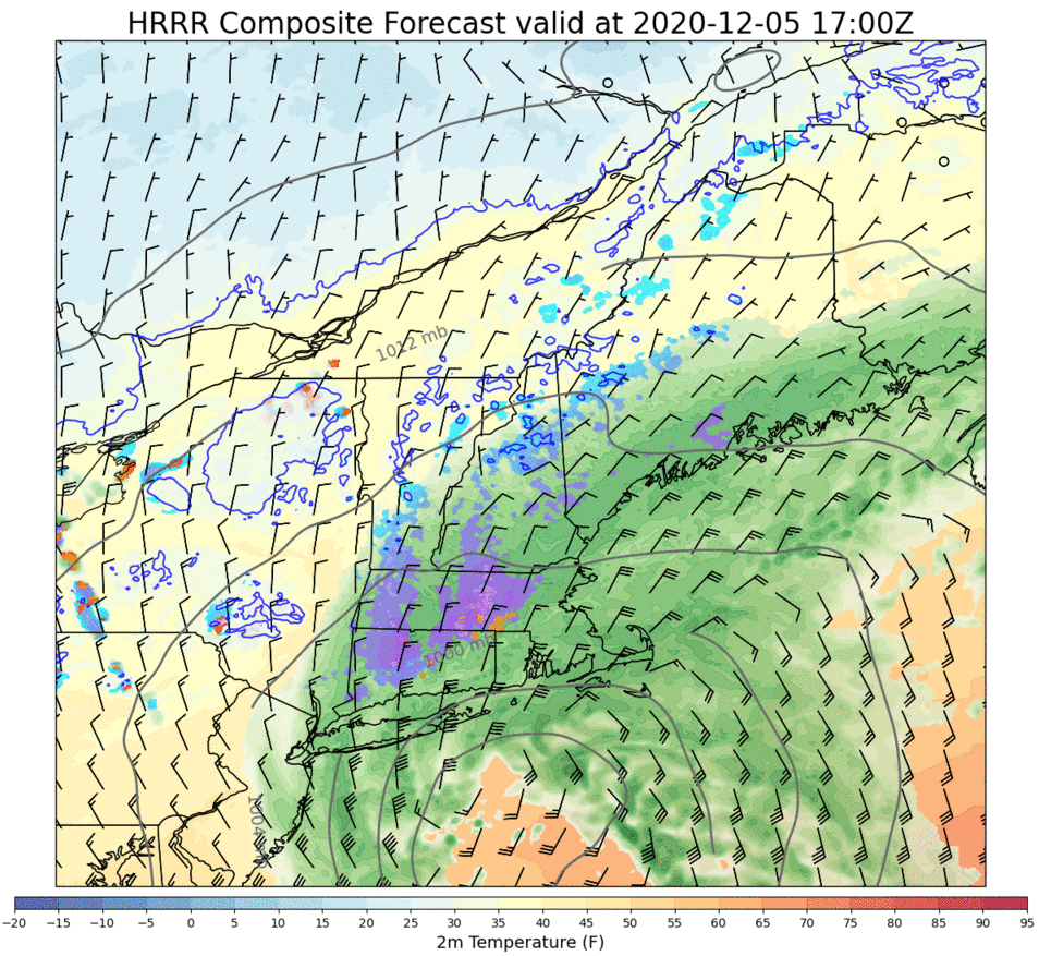Between noon and 5 PM, the timeframe covered by this forecast loop, most of the area will change from rain to snow in response to the dynamic cooling process I described above. The exception will be portions of the Midcoast east of Bath and south of Route 1 where the warm air ahead of the storm will be a bit more resilient.
