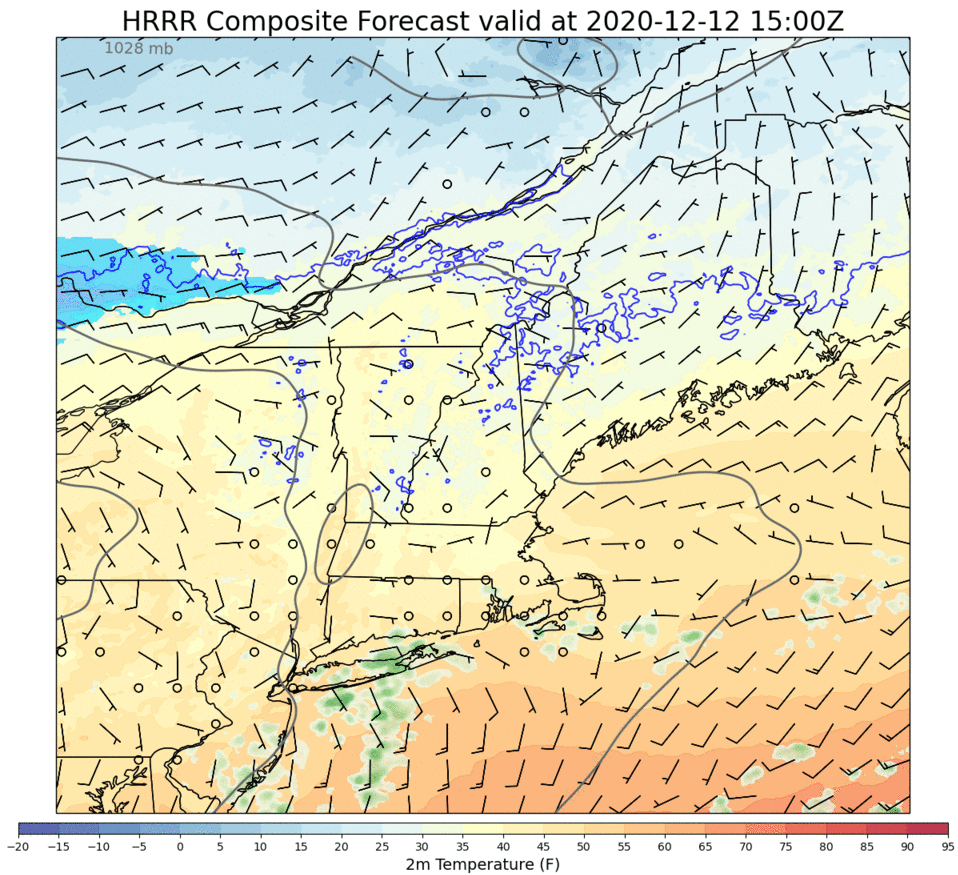 This loop shows model forecast precipitation type (green = rain, blue = snow) from 5 AM to noon. Note that by noon, it’ll be raining fairly heavily along the coastal plain and pockets of snow will begin to develop in response to a process known as dynamic cooling.