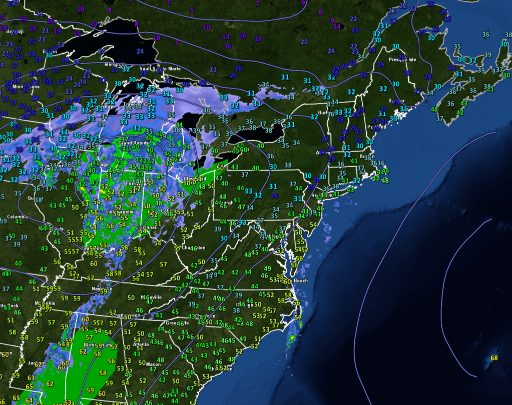 This map shows several different analysis and observation products but most relevant for most of are the temperature observations which are all the little numbers. Note that our area is embedded within the warm sector of a low over Hudson Bay which means temps are generally in the upper 30s to mid 40s. A cold front is noted over the Great Lakes and behind it, temps are much cooler (10s/20s).