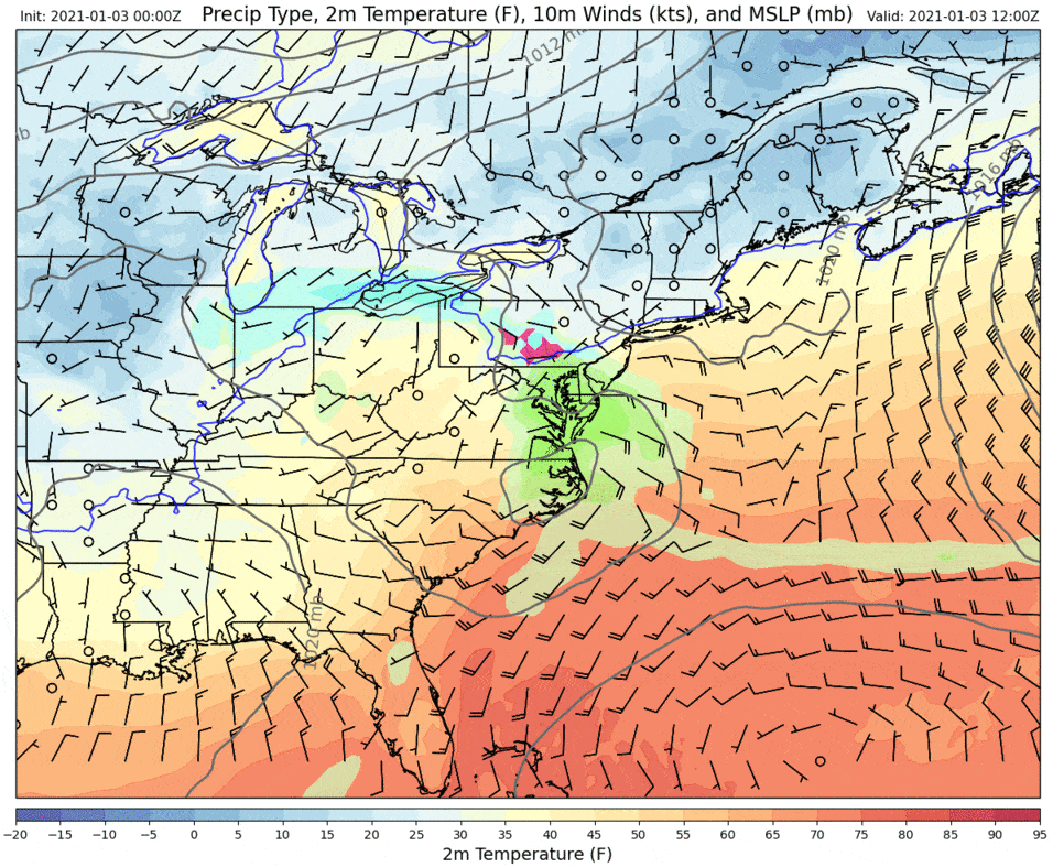 This loop shows that “stalling” process with bands of heavy precipitation lurking just northwest of the low’s center. Right now, most forecast model guidance suggests that these heavier bands will stay just offshore. This would keep snowfall totals fairly modest especially in the foothills/mountains. However, a wobble 50-75miles northwest would mean that instead of lingering over the ocean, these heavy bands could linger onshore and drop substantial totals.