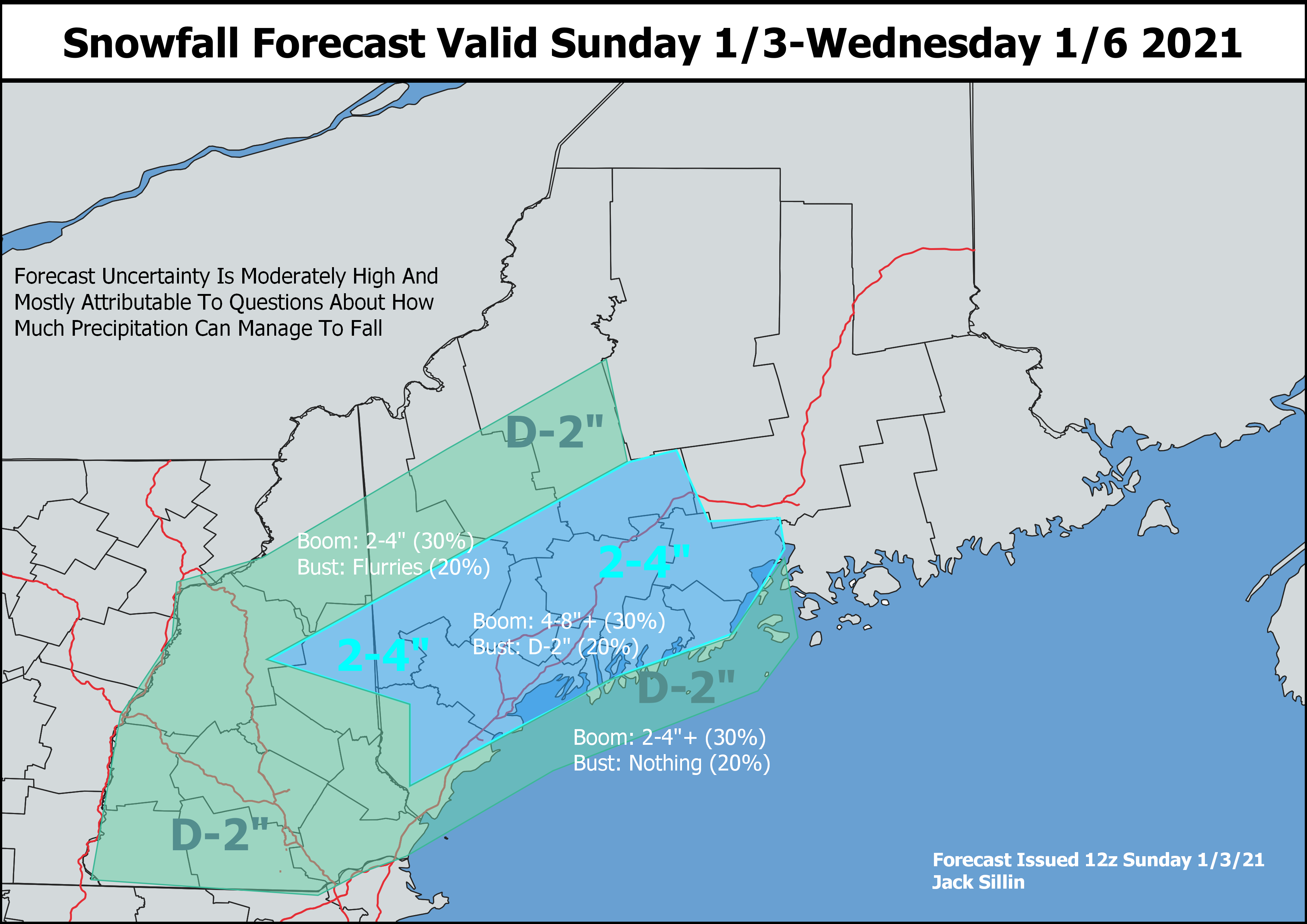 The highest totals I think will be found in interior parts of the Midcoast where I bet we’ll see plenty of 4,5, and 6″ reports. Confidence wasn’t quite high enough to include a 4-8″ contour but I was pretty tempted between Augusta/Waterville, and Camden/Belfast. Otherwise, there are some solid hints of a band setting up from the Whites through the ME foothills so I tried to reflect that in the 2-4″ contour. Surface temps will be right around freezing for most of this event which means that accumulation will be tough and heavily dependent on precipitation intensity right at the shoreline.